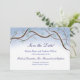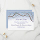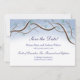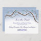 Platt spara datum kort för det romantiska Vinter snö Trädgrenar bröllopspaketet. Designen har akvarell trädgrenar med tallbarr som bildar en båge runt marinblå ord. Snö på en blå himmel visas på baksidan. Föreställ dig en slädfärd genom en vinter arboretum.