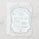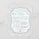 Grå snöflinga bakgrund med silver glitter trim och pudrig blå och vit prickig band med spets-look trim kant. Lappverk fana banner och silver snöflingor vinter säsong baby shower inbjudan kort design.