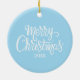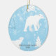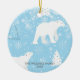 Personlig julgranskula i keramik med söta isbjörnar och fallande snöflingor på en isblå bakgrund med familjens namn och år i ett klassiskt grått typsnitt. Baksidan har 'God Jul' i ett vitt skrivstil med året på en matchande isblå bakgrund.