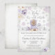 Fira ankomsten av din lilla med denna charmiga vintertema-baby shower-inbjudan med en söt teddybjörn i lila kläder omgiven av snöflingor och pastellfärgade blommor. Perfekt för en mysig säsongsfirande, denna eleganta design sätter tonen för en glädjefylld fest. Med sin snöiga landskapsbakgrund och stilrena typografi är det ett idealiskt val för blivande föräldrar som vill ha en festlig men hjärtvärmande inbjudan. Bra för vinterbaby shower, denna kort blandar nyckfullhet och sofistikation för att glädja gästerna och skapa bestående minnen.