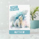 Ett sött färgfödelsedagskort med en björn som firar vintern på framsidan med "Grattis på födelsedagen" i ett vitt, fetstilt teckensnitt med versaler. Anpassa fronten genom att lägga till ditt/dina namn. Kortets baksida har plats för det skrivna eller handskrivna meddelandet.