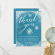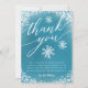 Tack för att du har ett kort med vit glödande snö och snöflingor med en typografisk text som säger "tack". Det redigerbara meddelandet tackar gästerna för att de kom till duschen och för presenten. Bakgrunden är blå. Underbarare för en pojkes juldusch.