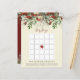 Detta Baby Shower Bingo Spelkort har mörk röd text med en kaskad av röda rustika blommor, röda järnekbär, gröna blad och frodiga skogskvistar. Baksidan av detta kort har mörk röd färg med en kaskad av frodiga gröna blad, röda järnekbär, rustika blommor och skogskvistar.