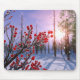 Ljus röda bär täckta av gnistrande is mot bakgrund av en lysande vintersolnedgång bakom kala träd och mörka tallar.