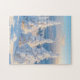 En vacker bild av en syn från toppen av ett snöberg. Tittar genom snö täckte träd i gräs på den vackra dalen nedanför.