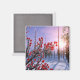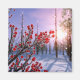 Ljusröda bär täckta med mousserande is mot bakgrund av en glödande vintersolnedgång bakom träd och mörk gräs.