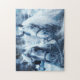 Ett pussel med ett foto av ett par hästar som hänger ihop. En snödag och ett blått filter skapar en magisk scen.