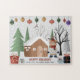 Vinterbjörn och träd Glad helg julmunstycke som har en björn i vinterkläder, ett hus, träd, gåvor och prydnadsföremål.