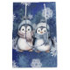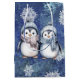 Vattenskärtpenguiner för vintertid med halsdukar och hattar på blå och vit snöflingerbakgrund.