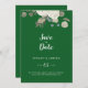 Denna vinter-blommigt på larmkortet grönt bröllop spara datum är perfekt för en elegant jul bröllop. Den enkla designen har vita blommor med vintern grön och eukalyptus löv, med en modern land-känsla.