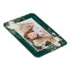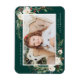 Elegant helgdag fotomagnet med ditt favoritfoto inramat av buketter av elfenbensfärgblommor, lush grönt foliage, gräs cones och hollybär mot bakgrund av en grönt av skogen. Anpassa helgdag genom att lägga till ditt namn och en anpassningsbar hälsning.
