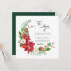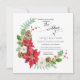 Kvadratisk formatinbjudan. Enkelt. Modern. Elegant. Idealisk för ett vinterbröllop skapades jultomten säsong av konstnären Audrey Jeanne Roberts. Knivande: Den moderna stil-andedräkten dekorerad med röda poinsettimiblommor, hollad med bär, mistletoblommor, blommor av vit vild ro med gräs-koner och sprit. Copyright.