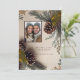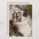 Lägg till ditt favoritfoto. Vacker vinterbröllops inbjudan med fina kottar, tallgrenar och gyllene accenter på en krämig gradientbakgrund.