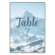 Det vackra bordsnumret i bergsområdet bröllop har ett starkt foto av berg med tak över snö på vintern. Anpassa i blått skript över backe. Perfektens fotodekoration för ett kall väder bröllop.