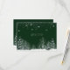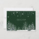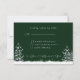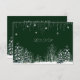 Vacker bröllopsbekräftelsekort med vacker mörkgrön bakgrund, med ömtåliga snöflingor, vita vinterträd, tallar och hängande vita ljus.