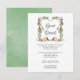 Detaljerad informationskort för bröllopsgäster med snöig, rustik tall- och granblomster vattenfärg på en bakgrund med salvia grön vattenfärg.