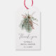 Minimalistisk rustik vintertagg med en vattenfärgblomma arrangemang av tallbarr, röda bär och eukalyptusgrönska. Med elegant handskriven kalligrafi.