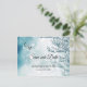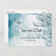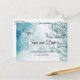 Elegant och modern SPARA VÅR DATE-vykort för att skicka dina gäster. Svart manuskalligrafi med vinter-underlandscen med nyblå färg. Online personlig - mallar som gör det enklare att redigera. Lägg till texten framför och bakom kortet. Kontaktdesigner för speciella förfrågningar.