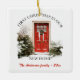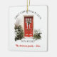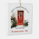 En kvadratisk keramisk julprydnad med en vacker vattenfärg-stil illustration av en röd ytterdörr som dekoreras för helgdagarna. Infartsvägen är kantad av en frisk krans, snö-dammad träd och en fredlig vinterscen, som symboliserar värme och firande i ett nytt hem. Under teckningen står anpassadet "Första julen i vårt nya hem" och "NAMN FAMILY - 20xx".Du kan anpassa den med texten. Detta prydnadsföremål är en tankfull hjärtefråga för familjer som firar sin första jul i ett nytt hus.