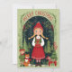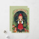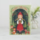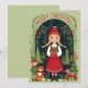 Whimsical julillustration av en flicka i traditionell dräkt med tomte, räv och dalahäst i festlig skog