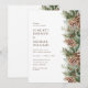 Denna moderna vinterfirande bröllopsinbjudan har handmålad akvarellgrönska och kottar arrangerade som en vacker sidram. Texten är brun och bakgrunden är vit. Hitta matchande föremål i samlingen Pinecone and Greenery Christmas Holiday.