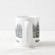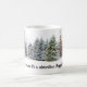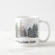 Denna vintermugg har snöklädda skogsträd i bakgrunden och texten "Vintern är inte en årstid, det är en firande. Glad Vintersolstånd. Använd muggen för din firande och under hela vintersäsongen.