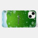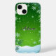 En pulserande vintern-tematisk utformning som visar vitt snöflingor på en vibrerande bakgrund inramad av frostigt blad.