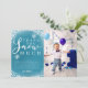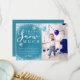 Snygg vinter snö tema födelsedagsfest tack foto mall kort i turkosblå med vit glödande snö och snöflingor med en typografi manus text som säger "tack snö mycket". Den redigerbara meddelandet tackar gästerna för att de kom till festen och för presenten. Bakgrunden är blå. Bra för en pojkes jul säsong 1:a födelsedagen. Lägg till ditt barns bild bredvid meddelandet.