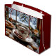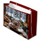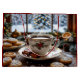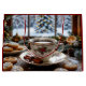 En vacker, unik julklapp med en festlig illustration av ett kaffe i finare vintage kopp av varmt kaffe bredvid en platta av sockerkakor och kanel.