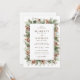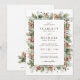 Denna vinterbröllopsinbjudan har handmålad akvarellgrönska och tallkottar arrangerade som en vacker ram. Texten är brun och bakgrunden är vit. Baksidan har en snygg matchande bukett. Hitta matchande föremål i Pinecone och Greenery Christmas Holiday kollektionen.