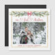 Vårt första magnetfotokort för jul med ditt foto. Denna utformning har en guld-effekt, rektangulär ram med vintern grönlöv och röda bär. Texten "våra första chirstmas" skrivs i kalligrafiskt stil med anslutningshjärtan.