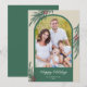 Ett elegant julkort med ett trendigt böjt foto. Designen är accentuerad med vintergrönhet och bär och en mörkgrön färg.