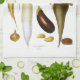 En vacker vintage som illustrerar gurkor, rotfrukter och äggplantor. Mycket skarp och ren på en underbar kökshandduk av god kvalitet. Gör en perfekt hemmavärmare. Köp en uppsättning idag för din favoritkock! En mycket vacker vintage. Bon Appetit!