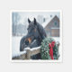 En mörk häst står med ett snö-täckt trästängsel, försedd med en frisk andedräkt som dekorerats med ett rött band