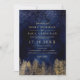 Vinterskogen i träd, bröllop, med träd i guld och gräs, som visar ett underland av trämark och vitt fallande snö, med elegant och modern typografi på en marin blå vattenfärg.
