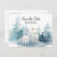 Utomhus, vildmarksbröllop spara datum-kort, med vacker akvarellkonst av träd med hjortar och vackra vintertallkottar och blommor utförda i mjuka pastellfärger. Anpassa texten efter dina bröllopsbehov. Matchande produkter finns tillgängliga.