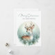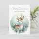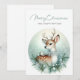 Fira årstiden med det här fredliga julkortet som visar en varsamt hjort smyckad med en snöflinga och vintergrön krage, omgiven av tallgrenar, vita bär och sakta fallande snöflingor. En delikat vit fågel som sitter på hjortens rygg tillför en glädje, medan den bleka blåa övertoningen i bakgrunden frammanar en lugn vinterskog. Den graciösa hälsningen "God Jul och Gott Nytt År" fullbordar den här tysta scenen, perfekt för att sprida värme och förundran.