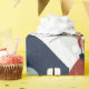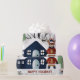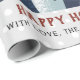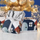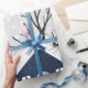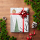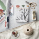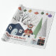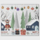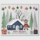 Vinterhjort, träd och hus God jul julklappspapper som visar en hjort i vinterkläder, träd, ett hus, julgransprydnader och presenter.
