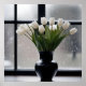 Bild framför ett frostiskt fönster i ett svart Vas är vita tulippar