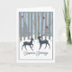 Denna fredliga vinterscen skildrar två hjortar i skogen i blått och vitt tonvis, med ljusröda accenter från norra kardinalerna i träd. Ord Season hälsningar är centrerade nedan.