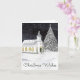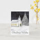 Julkortet har en ursprunglig vattenfärgsmålning av en snöfärgad land-kyrka under en stjärna fylld himmel.