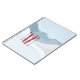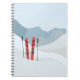Abstrakt vinterlandskap med panoramisk bergsvy, rödskidutrustning, spåret och blå himmel