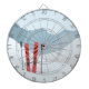 Abstrakt vinterlandskap med panoramisk bergsvy, rödskidutrustning, spåret och blå himmel