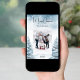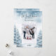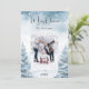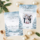 Vattentäckt vinterskog som bakgrund. Anpassa och lägg till din familj namn och ett foto. Snö överlägg. God jul skrivet med ett stil-skript som hanteras med trendig. Tillbaka: lägg till ditt meddelande och namn.