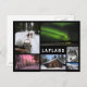 Kollagekort av olika landskap och ikoner i Lappland under vintern, såsom husky safari, skidåkning, norra ljus och loggkabiner med många snö med svart ram och texten: "Lappland". Underbar vintersouvenir!