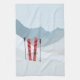 Abstrakt vinterlandskap med panoramisk bergsvy, rödskidutrustning, spåret och blå himmel