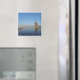 Sövenirs fotokylmagnet med landskap på landsbygden i Nederländerna på vintern med kvarn, is på floden och frostade regn under ett tydligt blå himmel.