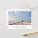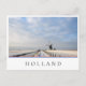 Fotovykort av minimalistisk syn på ett vinterlandskap i Nederländerna med väg och en kanal mot en kvarn under lagrar av snö med fina moln vid soluppgången i den nederländska landsbygden med ett vitt gräns och i en vit låda texten "Holland" och med rand i färger rött, vitt och blått, färgerna på den nederländska flagga.