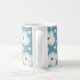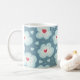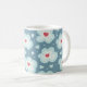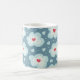 Cute vintertid mugg med mönster av moln och hjärta. Varje abstrakt har blått moln ett vitt centrum med rosa hjärta. Blåhjärtan och prickar fyller en mörkare blå himmel. Denna söt viskare mugg kommer att göra en underbar Valentindagspresent till en älskad.