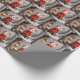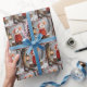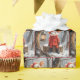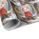 En söt mus som är klädd i en varm rödplats på en träd-stump omgiven av en snöskog